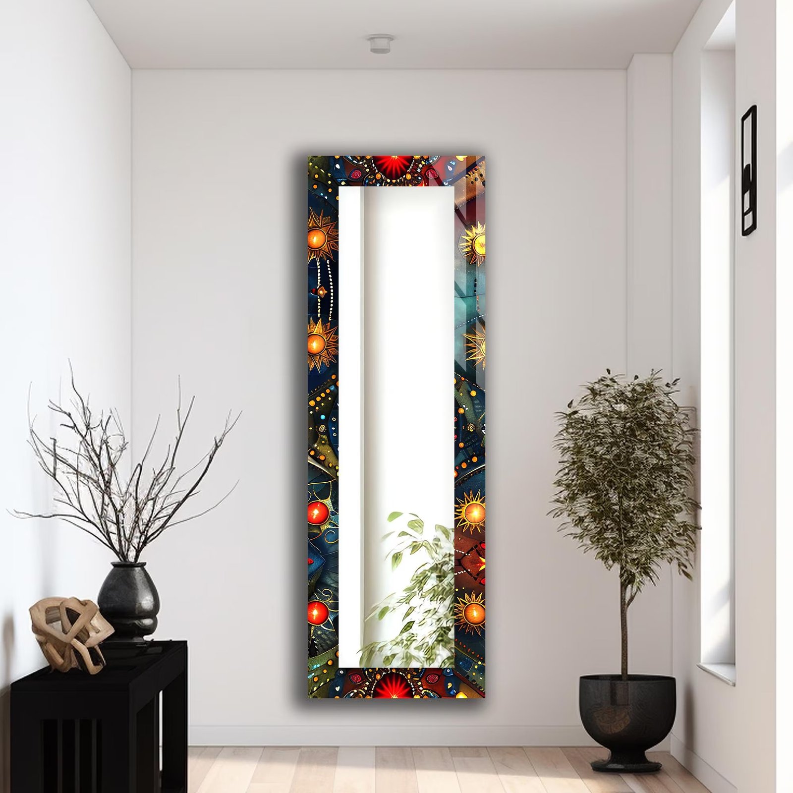 The perimeter of the mirror is transformed by a vivid UV print technique, showcasing a complex mandala pattern rich with celestial motifs and warm, sun-inspired hues. This HD printing process is specifically engineered to “maintain rich, bright colors over time”, ensuring that your investment remains as striking as the day it arrived. The artwork is layered onto 4mm high-quality tempered glass, which provides a crystal-clear reflection through its integrated HQ glass mirror component.