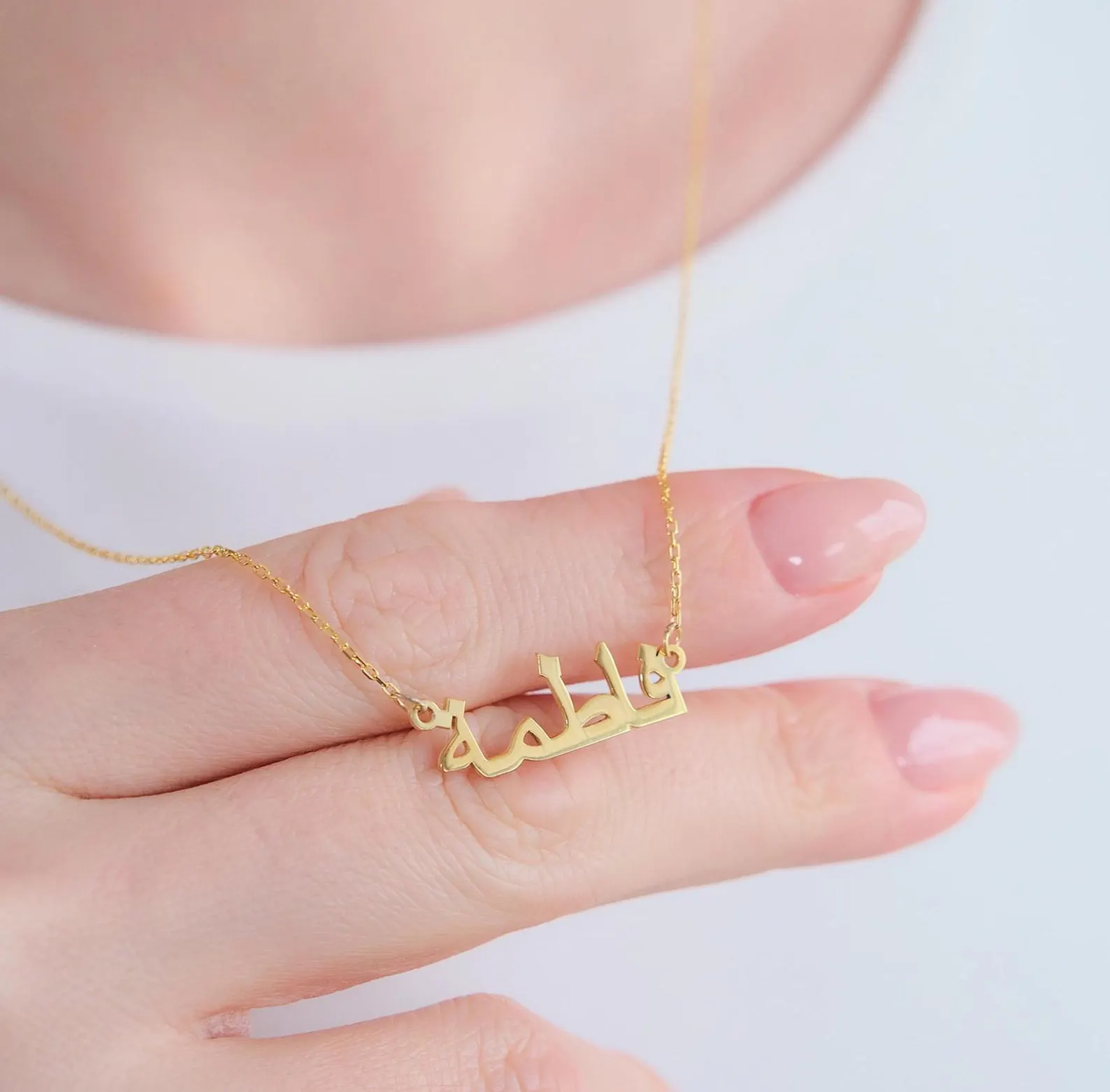 تألقي باسم "فاطمة" بأناقة مع هذه القلادة التي تحمل الاسم العربي. قلادة نحاسية عالية الجودة مزينة بنقوش عربية مصقولة.