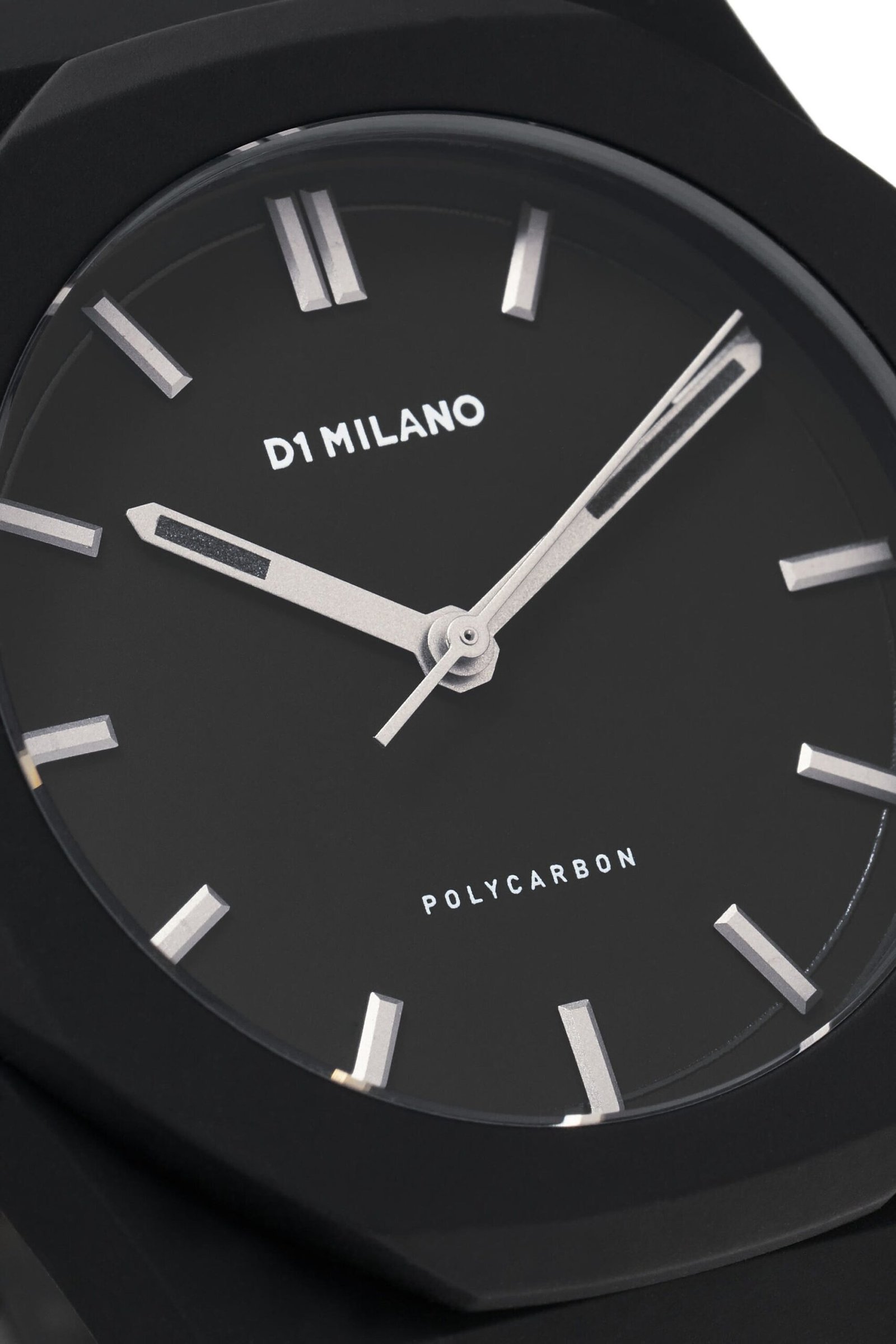 Redefine modern wristwear with the D1 Milano Polycarbon 40mm Moonglade Watch. This ultra-lightweight timepiece features a sleek black polycarbon case contrasted by a striking silver stainless steel bezel. Equipped with Japanese quartz movement, anti-reflex mineral glass, and Luminova-coated indexes, it offers a perfect fusion of Italian aesthetic and durable, everyday functionality.