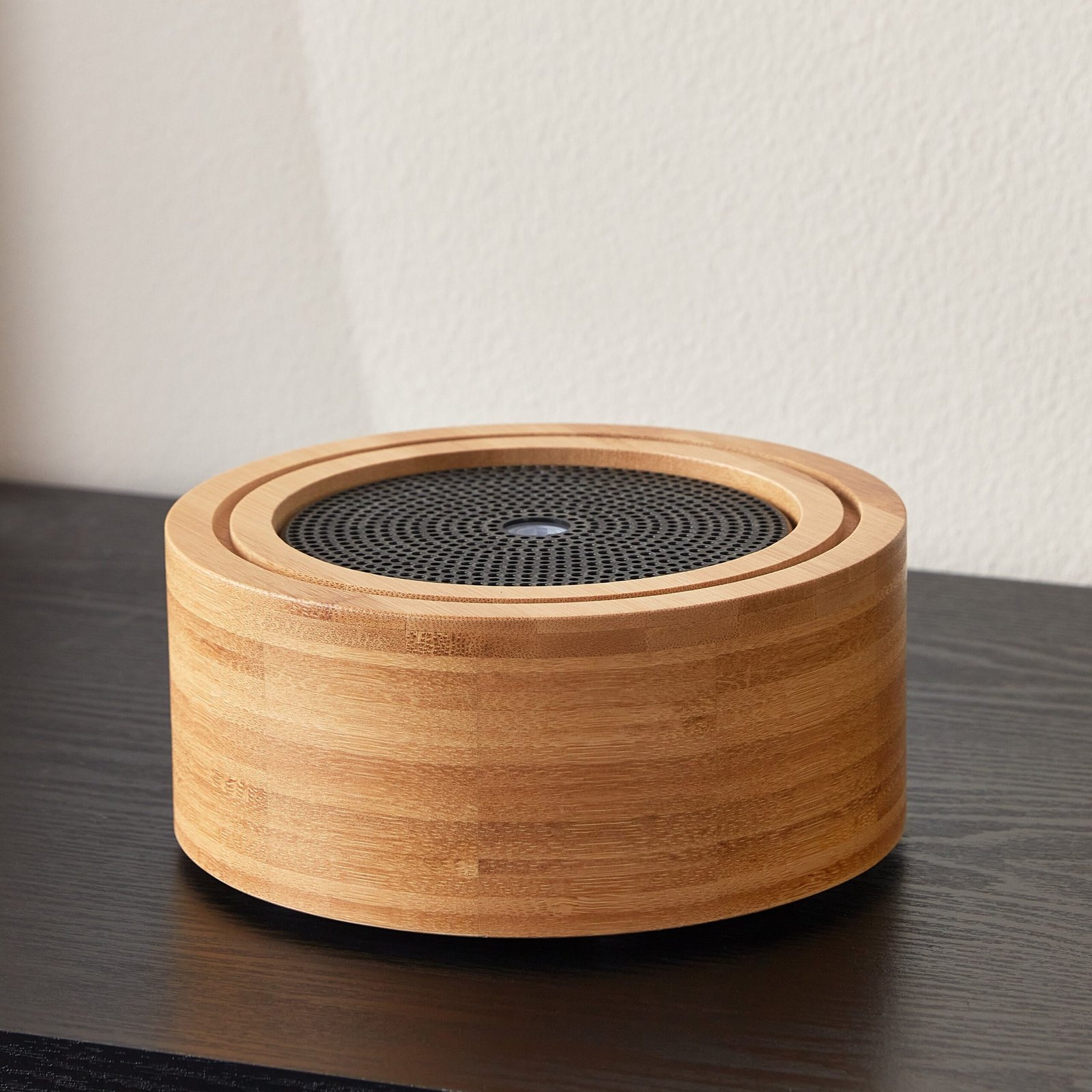 The 100 ml (3.3 fl. oz.) water tank is optimised for a continuous runtime of 3 to 4 hours. Its circular bamboo exterior offers a modern, earthy aesthetic that masks the sophisticated internal humidifier components. The two-tone bamboo finish ensures that it remains a decorative asset even when not in use.